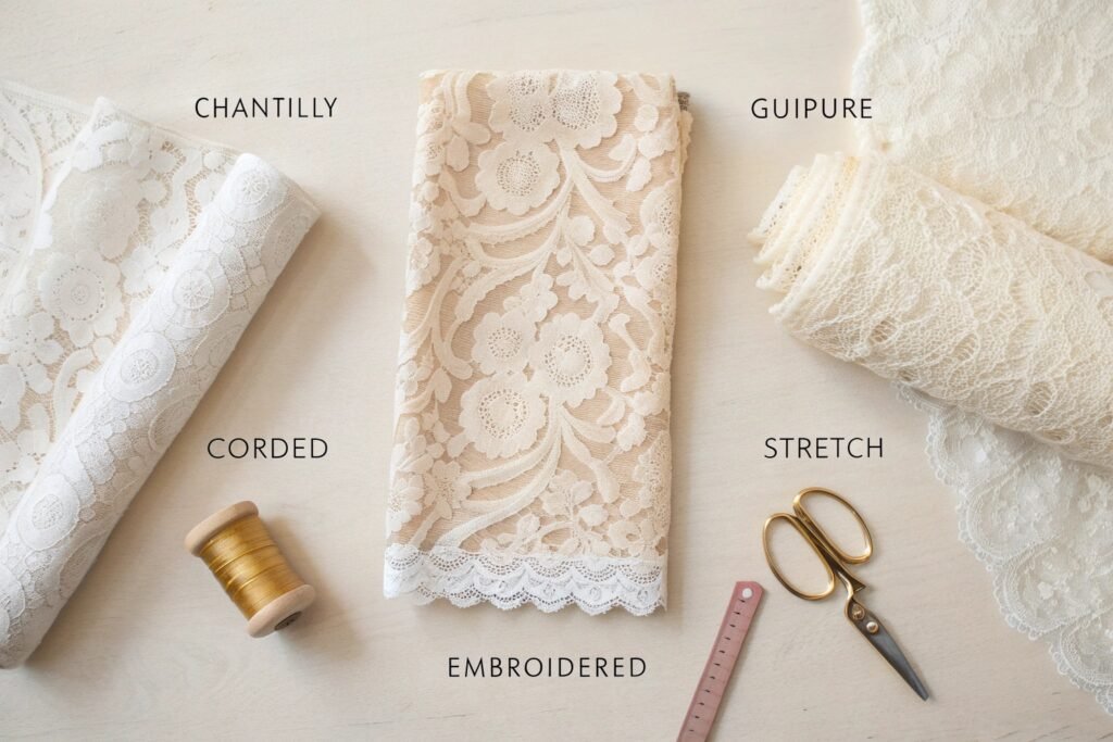 Not all lace is created equal when it comes to bridal design. Choosing the right lace depends on your desired silhouette, fabric layering, and dress movement. Each type has a distinct drape, transparency, and texture.
