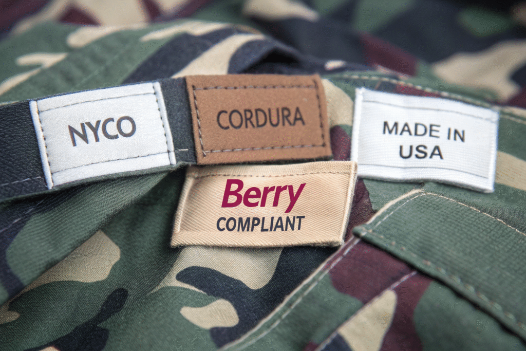 Berry compliance means every component of the textile—from fiber production to dyeing and final finishing—must be made in the United States. For camouflage fabrics, that includes yarn spinning, weaving, printing, coating, and quality testing.