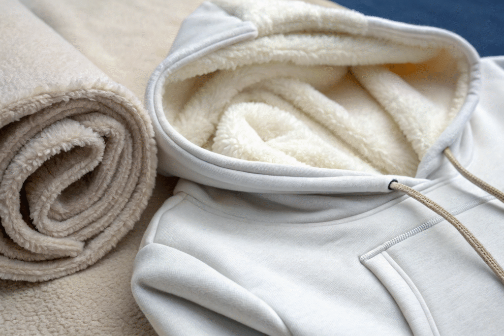 Cotton fleece is perhaps the most iconic hoodie fabric. It is knit on the outside for durability, while the inside is brushed to raise soft fibers, creating that familiar plush layer everyone associates with comfort.