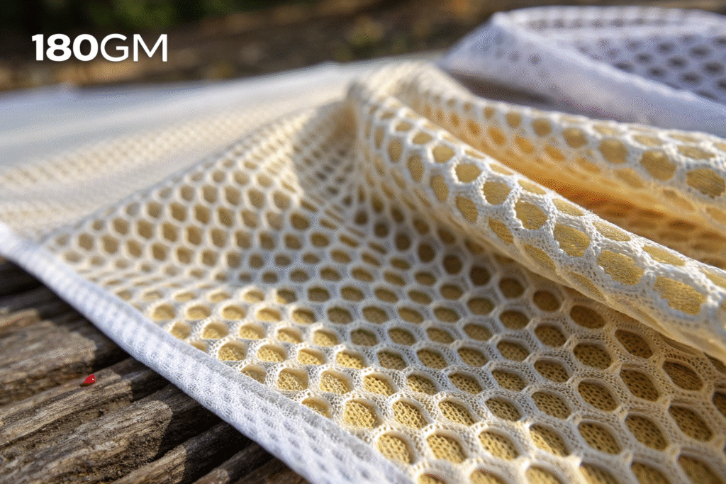 Honeycomb weave traps air—cools skin. We knit 180gsm. Holes vent sweat.
