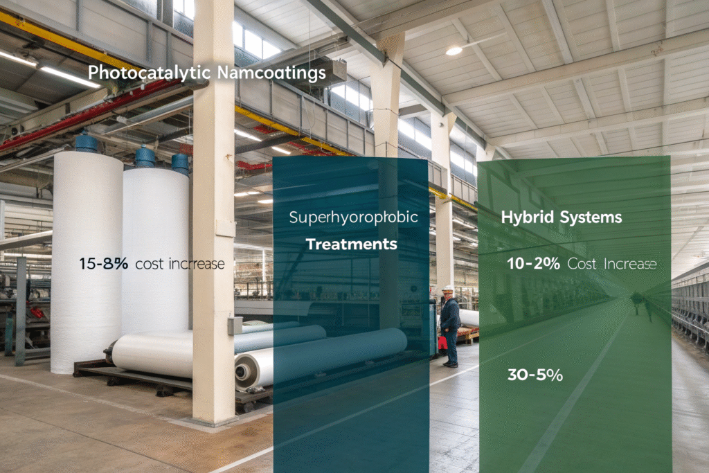 Cost considerations dramatically impact viability. Photocatalytic nanocoatings add 15-25% to fabric cost, while superhydrophobic treatments typically add 10-20%. Hybrid systems can increase costs by 30-50%, making them suitable only for premium applications. Production scalability also varies—superhydrophobic coatings integrate easily into standard finishing ranges, while photocatalytic applications often require additional curing steps.