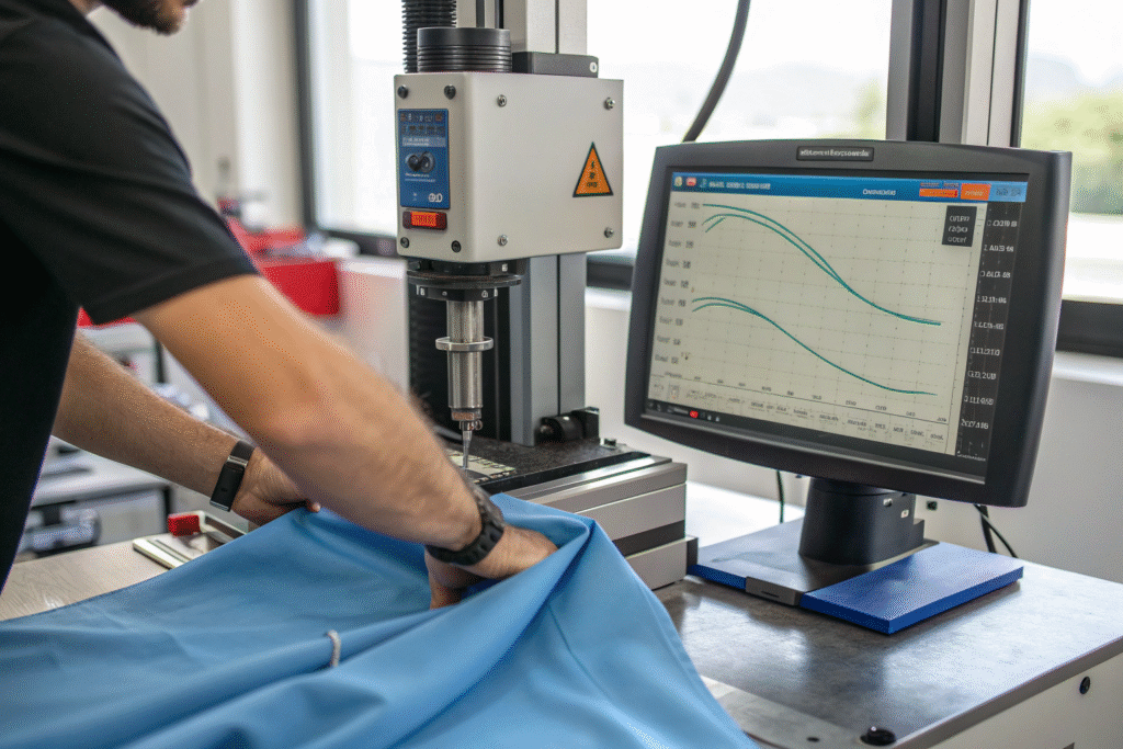 Strength tests catch weak points—ISO 13934-1 grab tensile, ASTM D5034, ISO 13937-2 wing tear. We sample 5 points per direction.