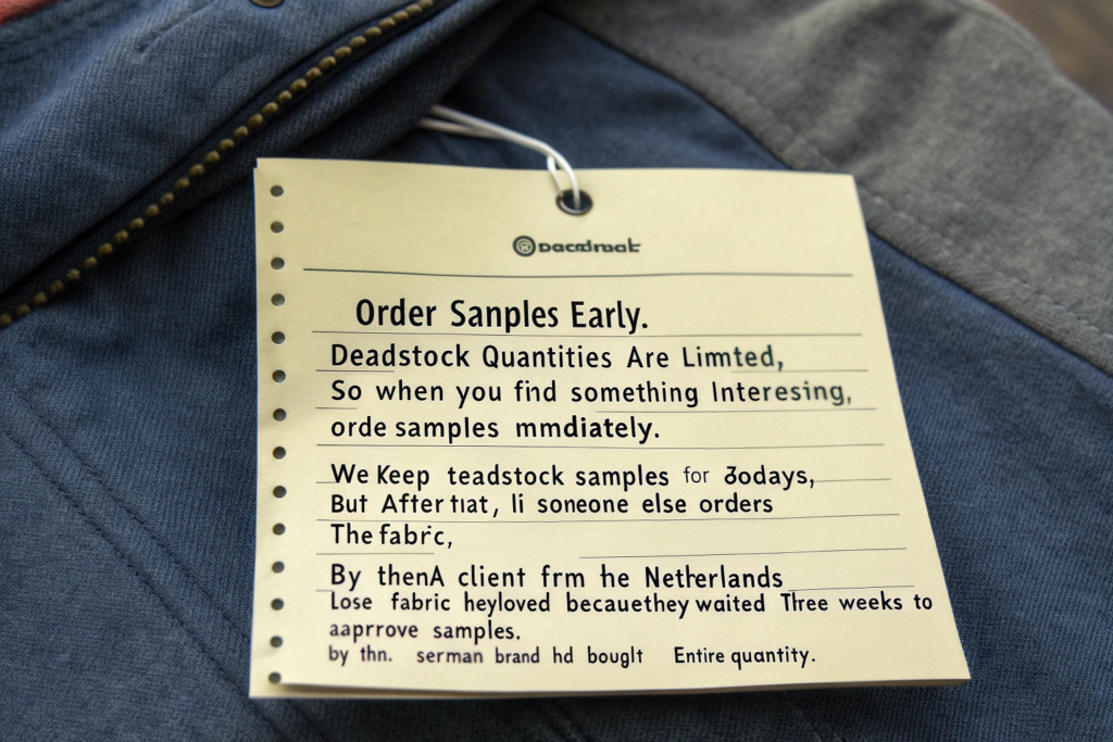 Order samples early. Deadstock quantities are limited, so when you find something interesting, order samples immediately. We keep deadstock samples for 30 days, but after that, if someone else orders the fabric, it's gone. We had a client from the Netherlands lose a fabric they loved because they waited three weeks to approve samples. By then, a German brand had bought the entire quantity.