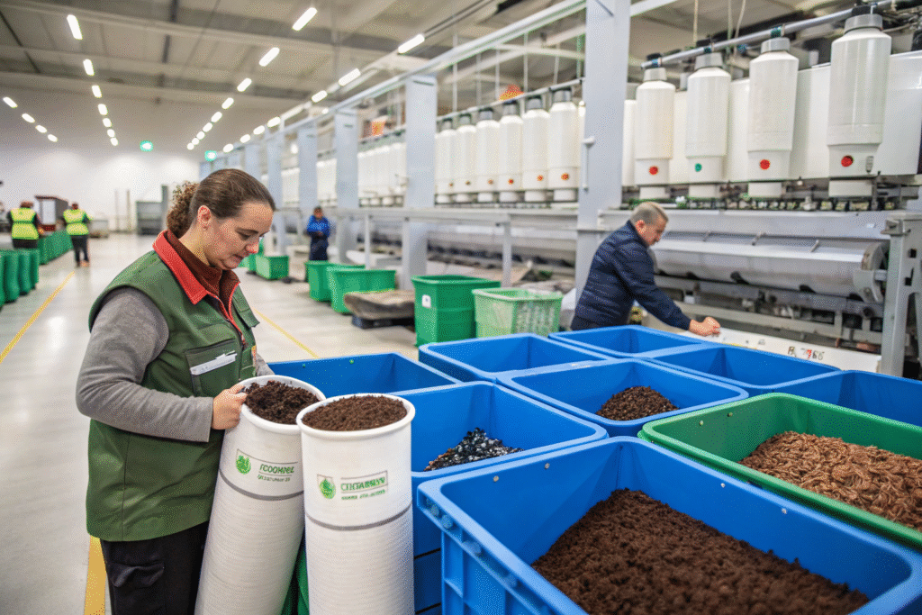 First, used coffee grounds are collected from local cafés. After drying and milling into nano-sized particles, they’re mixed with recycled PET chips (rPET). This blend is then melted and spun into yarn. Unlike chemical finishes, these coffee particles are embedded within the fiber core, making the function permanent.