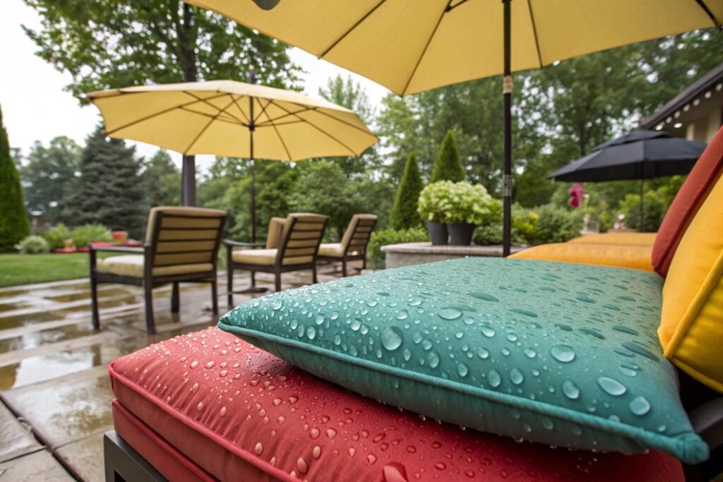 Polyester is cheaper and dries fast, but it fades quickly under UV. It’s often used in entry-level umbrellas or patio seating. However, most polyesters must be topically treated, which wears off over time.