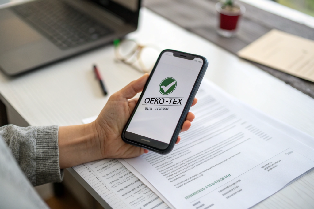 - The OEKO-TEX Certificate Validity Confirmation: A live link to the TESTEX database showing our status as "Valid."