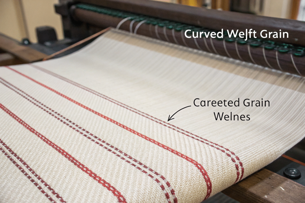 - Bowing (Center sag): The weft yarns dip down in the center like a bow.