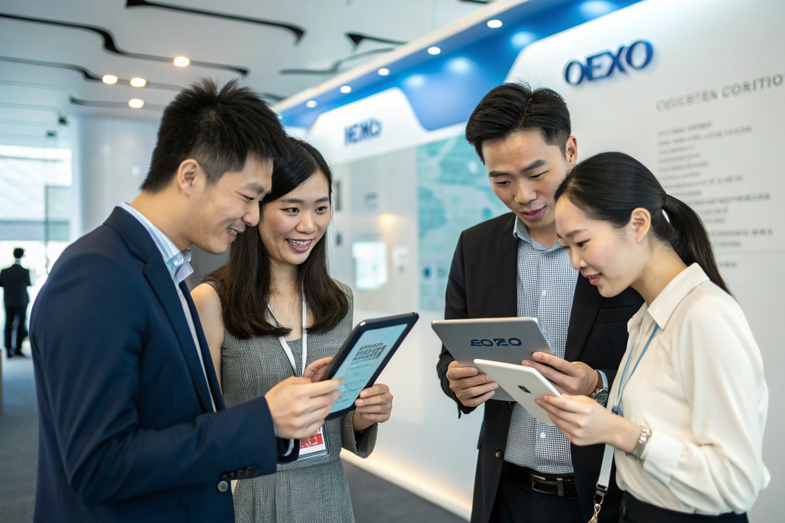 Recraft指令--A professional business networking scene on a digital platform interface. A diverse group of fashion industry professionals in modern business casual attire are actively engaging with a tablet displaying OEKO-TEX certification details. The background shows a sophisticated office environment with subtle branding elements. The style should be realistic and professional, using a color palette of corporate blues and clean whites, with interactive digital elements visible. No maps or text should appear on any surfaces. All human faces must be clear and realistic without distortion, showing genuine professional engagement.