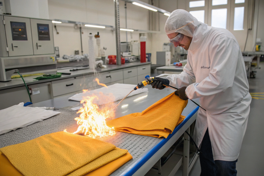 Testing includes flame spread resistance, seam durability, shrinkage, and tensile strength. Independent labs perform audits to verify compliance. Manufacturers must also undergo continuous production checks to maintain certification, which ensures consistent quality.