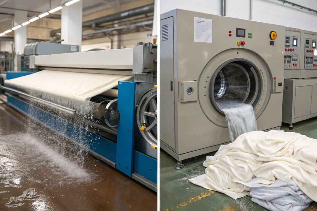 3. Mechanical compression. This is the key step that separates compacting from simple washing. The fabric is fed between a heated roller and a rubber belt that compresses the fabric. The rubber belt is running slightly slower than the fabric feed, so the fabric is literally pushed together. The loops are forced to relax.