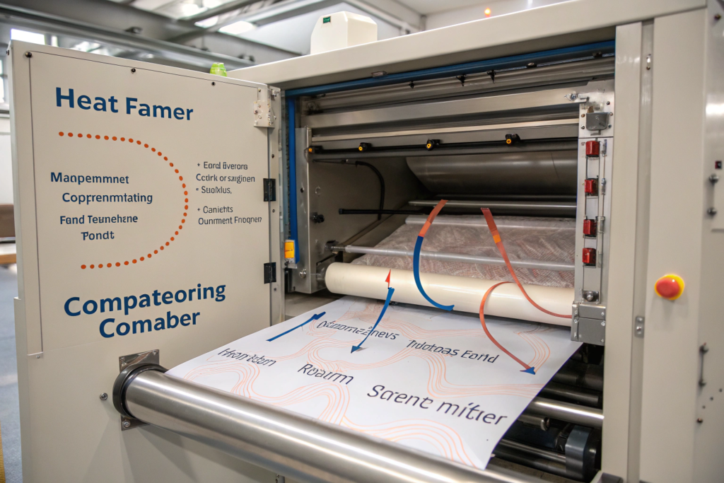 1. Heat. The fabric passes over heated rollers. The temperature is precisely controlled based on the fiber content. For cotton, we use about 150-180°C. For polyester blends, the temperature is lower because synthetic fibers are more heat-sensitive.
