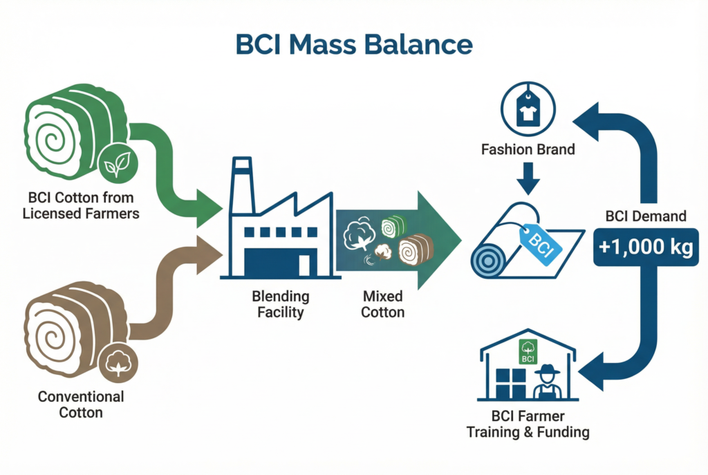 Think of it like the green energy grid. When a power company adds solar energy to the grid, you can't trace specific electrons to your home. But by purchasing green energy, you ensure that the amount you use is added to the grid overall. BCI’s Mass Balance works similarly. BCI cotton from trained farmers is mixed with conventional cotton in the supply chain. For every meter of BCI-labeled fabric we sell, an equivalent amount of BCI cotton has entered the system. This drives demand and funding back to the sustainable farms, scaling impact in a way that’s practical for global trade. Your purchase directly supports better farming, even if the specific fibers aren't physically segregated.
